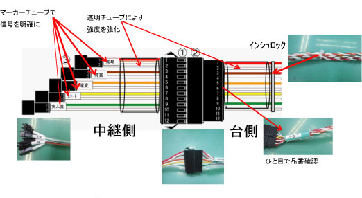 *配線をビニールチューブに入れることによって 配線の劣化を防ぎまた絡まる事もなくなります。 *中継側にマーカーチューブを入れ 差し違いを無くします。 |